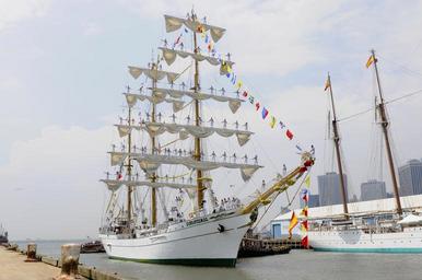 Keywords: ship sailing sailing-ship sailing vessel mexican men sailors manning the mast flags bay harbor water new york city buildings urban skyline architecture outside summer