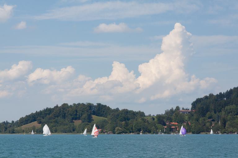 Keywords: ship sailing vessel boot sail hill forest water lake sky blue white bavaria free state tegernsee bank upper bavaria holiday recovery summer sun landscape