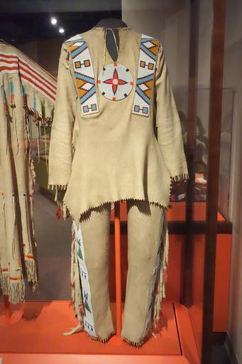| Keywords: Shirt and leggings, Tsuu T'ina, 1890s, hide, weasel tails, feathers, glass beads, brass - Glenbow Museum - DSC00848.JPG  en Exhibit in the Glenbow Museum 130 9th Ave S E Calgary Alberta Canada This work is old enough so that it is in the public domain Photography was permitted in the museum without restriction 2013-09-21 12 21 49 own Daderot cc-zero Aboriginal peoples clothing in the Glenbow Museum Uploaded with UploadWizard Tsuu T'ina clothing Fur clothing of native people of North America Tsuu T'ina Weasel clothing Fur fashion in 1895 |