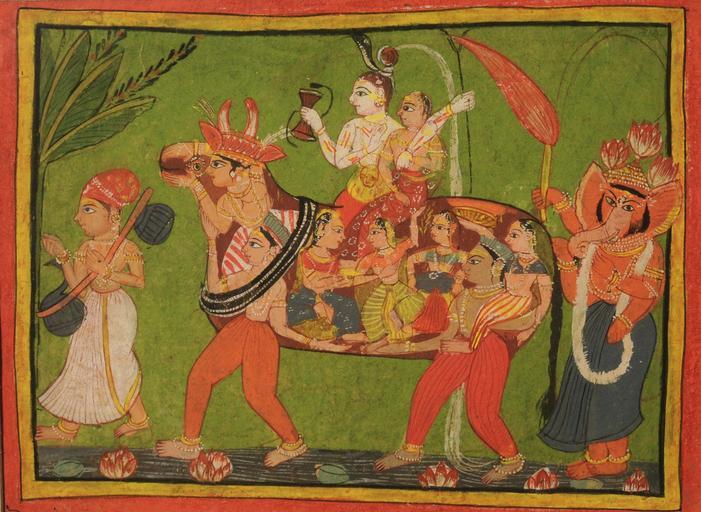 Keywords: Shiva and Parvati on a composite cow made of assembled women - Unknown, Rajasthan School - Google Cultural Institute.jpg A man playing a musical instrument leads the procession followed by Shiva and Parvati seated on a cow Four-armed Ganesh follows them with a fly-whisk attending the royal couple This narikunjan composite creature made of assembled women is very typical of Indian art Miniature Painting by unknown artist Rajasthan School Natural pigment on paper 18 X 25 cm 1775 - 1800 https //www google com/culturalinstitute/asset-viewer/shiva-and-parvati-on-a-composite-cow-made-of-assembled-women/3wFCTKnk6EKPJg PD-Art-100 Paintings of Shiva and Parvati Files uploaded by Yann Forget Paintings from Rajasthan Google Art Project works by unknown artist India 18th-century paintings from India Academy of Fine Arts and Literature |