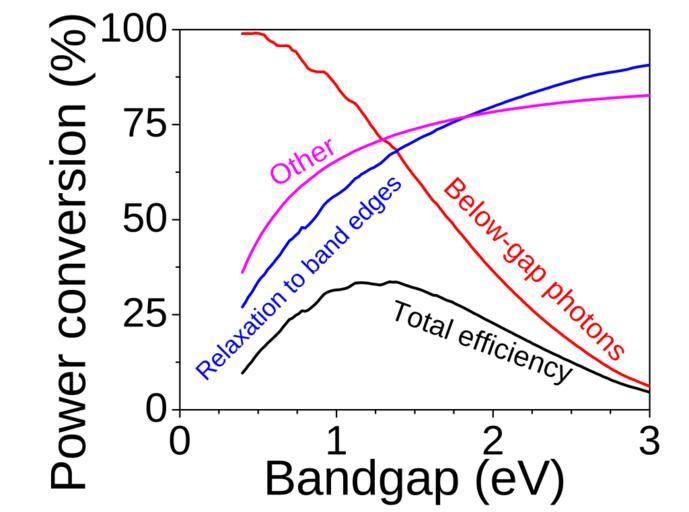 | Keywords: ShockleyQueisserBreakdown.svg en The Shockley-Queisser limit for the maximum possible efficiency of a solar cell black and its contributing factors other curves The x-axis is the bandgap of the solar cell The red curve is the ideal efficiency if the only loss was the fact that below-gap photons are not absorbed; the blue curve is if the only loss was the relaxation of hot photogenerated electron-hole pairs down to the band edges; and the pink curve represents the other losses namely the tradeoff between higher radiative recombination and lower operating voltage If you multiply together these three curves you get the black curve The curves are all wiggly because of IR absorption bands in the atmosphere I used the actual AM1 5G solar spectrum data I cross-checked my total efficiency curve with independently-calculated ones and they agree to high accuracy http //www opticsinfobase org/abstract cfm URI OSE-2010-SWA1 http //www opticsinfobase org/abstract cfm URI OSE-2010-SWC4 The other curves besides the black curve are not published in exactly this form to my knowledge but it's a straightforward part of the same calculation own Sbyrnes321 2011-02-16 The data-file for this graph is freely available ask me at http //en wikipedia org/wiki/User_talk Sbyrnes321 I did the calculation in Mathematica the plotting in Origin and the PDF-->SVG conversion in Inkscape The Mathematica source code is posted on my website http //sbyrnes321 byethost11 com/ Cc-zero Photovoltaic power schemas and diagrams Solar cell schemas and diagrams |