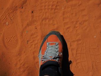 Keywords: shoe reprint traces sand tracks in the sand footprints footprint red reddish orange ochre colours shoe print shoe sole imprint sole imprint sand road