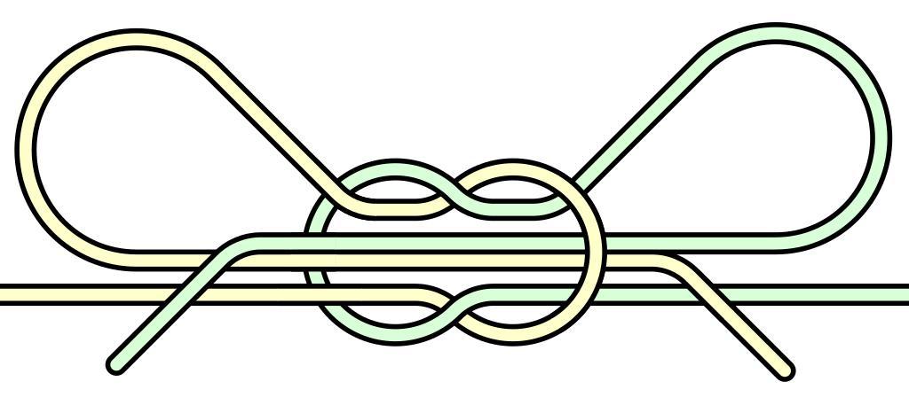 | Keywords: Shoelace knot.svg Schematized diagram of simplest shoe-tying knot slipped square-knot or bow Made from circular arcs horizontal lines and lines at 45-degree angles with a requirement that structural knot crossings be shown as close to perpendicular as possible see also Image Knots-decorative-inline svg Own - Converted from the following vector PostScript code <pre> 341 396 translate 35 dup scale 22 setlinewidth 1 setgray /z 20000 sqrt def/y gsave 40 setlinewidth 0 setgray stroke grestore stroke def 1 setlinecap 1 1 8 setrgbcolor z 6 5 mul neg z 1 25 mul neg 100 add moveto z 1 25 mul neg z 1 25 mul neg 100 90 45 arcn 0 0 150 225 135 arc z 1 25 mul neg z 1 25 mul 100 315 270 arcn z 1 75 mul neg z 1 25 mul 100 270 225 arcn z 4 8 neg mul 1 2129 sub z 1 3 mul 1 2129 add 200 45 270 arc 249 96 -114 9392 100 90 45 arcn 170 -170 rlineto y 85 1 85 setrgbcolor z 5 mul z 1 25 mul neg 100 add moveto 25 z mul neg z 1 25 mul neg 100 90 135 arc z 1 5 mul neg 0 150 315 45 arcn 25 z mul neg z 1 25 mul 100 225 270 arc 25 z mul z 1 25 mul 100 270 315 arc 3 35 z mul 1 add z 1 45 mul 1 add 190 135 270 arcn -455 239 -83 9392 100 90 135 arc -190 -190 rlineto y 0 setlinecap gsave 40 setlinewidth 0 setgray -400 16 0608 moveto 80 0 rlineto stroke -400 -14 9392 moveto 80 0 rlineto stroke 0 0 150 301 59 arc stroke z 3 mul neg z 1 25 mul neg 100 add moveto 150 0 rlineto stroke z 1 75 mul neg z 1 25 mul 100 269 225 arcn -50 50 rlineto stroke 321 67 -45 2285 moveto 68 -68 rlineto stroke grestore -401 16 0608 moveto 82 0 rlineto stroke 1 1 8 setrgbcolor -401 -14 9392 moveto 82 0 rlineto stroke 0 0 150 300 60 arc stroke z 3 mul neg 1 sub z 1 25 mul neg 100 add moveto 152 0 rlineto stroke z 1 75 mul neg z 1 25 mul 100 270 225 arcn -51 51 rlineto stroke 320 67 -44 2285 moveto 70 -70 rlineto stroke showpage EOF</pre> 2007 AnonMoos Square knots Knots in art and decoration Shoelaces Images with PostScript source code |