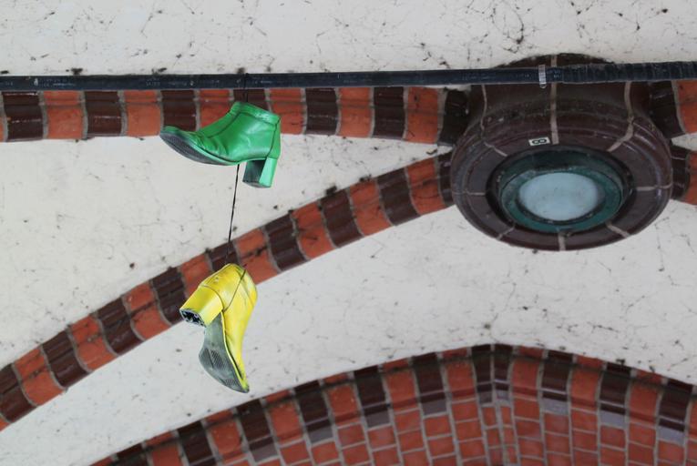 Keywords: shoes depend leash art shoelaces hang sole shoe colorful yellow green blanket vault masonry bridge stuetztpfeiler arches architecture pillar arcades berlin capital strange kreuzberg berlin kreuzberg