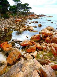 Keywords: shoreline beach ocean pacific close-up rocky nature outside outdoor rock isolated orange colorful tranquil