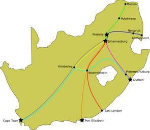 | Keywords: Shosholoza Meyl routes.svg Shosholoza Meyl routes 2012 svg Kaart wat die roetes van die Shosholoza Meyl aandui die Suid-Afrikaanse langafstand passsierstrein-operateur Map showing routes operated by Shosholoza Meyl the South African long-distance passenger rail operator Country border city locations traced from public domain CIA map Routes drawn in by me User Htonl 2006-05-16 User Htonl Released to the public domain Maps of South Africa | ||||