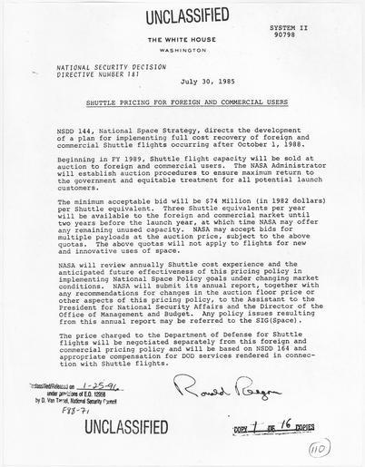 | Keywords: Shuttle Pricing for Foreign and Commercial Users - NARA - 198301.tif Scope and content General notes 198301 Local identifier President 1981-1989 Reagan National Security Council 1981 - 1989 Ronald Reagan Library NLRR 40 Presidential Drive Simi Valley CA 93065-0600 1985-07-30 Record group Collection RR-NSC Numbered National Security Policy Papers 1981 - 1989 Record group ARC 1189 National Security Decision Directives compiled 02/25/1981 - 01/19/1989 Series ARC 198166 File unit File unit ARC Variant control numbers NAIL Control Number NLS-NSC-NSDD-181 yes Other versions <gallery> File Shuttle_Pricing_for_Foreign_and_Commercial_Users_-_NARA_-_198301 tif tif File Shuttle_Pricing_for_Foreign_and_Commercial_Users_-_NARA_-_198301 jpg jpg </gallery> NARA-cooperation PD-USGov Presidential Decision Directives Reagan NARA TIF images with categorized JPGs |