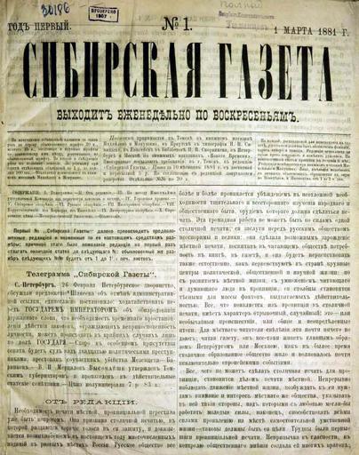 | Keywords: Sibirskaya gazeta.jpg en Sibirskaya gazeta - 1st page of 1st issue ru Сиби ская газета пе вая ст аница пе вого выпуска 1881-03-01 sun tsu ru/mminfo/000351029/1881/1 1 march djvu Sibirskaya gazeta PD-old-100 Uploaded with UploadWizard History of Tomsk Newspapers of Russia 1881 Newspaper front pages Media of Tomsk Newspapers of Russia to be categorised by name |