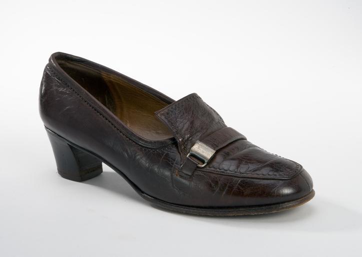 Keywords: Sibyllas bruna sko - Livrustkammaren - 75398.tif Höger promenadsko i mörkbrunt läder med svagt rundad tå och mellanhög klack Pumpsmodellen skuren i två stycken med söm mitt bak och mitt fram <br/>Ovanlädret förenas med de två styckena i en söm längs med tåpartiet och avslutas med en fyrkantig plös Under plösen går mellen de två sidstyckena ett resårband och ovanpå plösen sitter en läderem 15 mm bred spänd med ett metall spänne på vänster sida Dekorsöm i brunt längs med ovan lädrets ytterkant och upp längs med plösen samt längs med ovankanten på bakstycket Skons övre kant kantad med ett brunt skinnband b 12m <br/>Skon och plösen fodrad med ljusbrunt skinn Extra mörk brunt foder i hälen <br/>Inner sula av ljusbrunt skinn bakre delen och trampet fodrad med en extra sula med företags<br/>tryck i guld B 4529 // ESPECIALLY FOR AB NORDISKA KOMPANI //'NK-märke' // BALLY // SWITZWERLAND // SOUPLEMENT // PONTE R // SHANK // PAT NR 991415 På höger sida tryckt 5 5 5 506645 8 <br/><br/>Yttersula av rödbrunt läder Märkt under hålfoten med 5 1/2 och 5 <br/>Klack av rödbrunt trä med stiftlapp i gummi fäst med fem små metallstift original caption Sibyllas bruna sko LRK 12032 <br/> Nyckelord Loafer Sko Bruna Dammode Klacksko Föremålsbild 1957 leather Färg mörkröd ljusbrun material läder size mm 50 klack size mm 30 klack g 20 size mm 250 size mm 80 sula LRK Sibylla hertiginna av Västerbotten place of origin original filename lm_dig2303_12032 48627 inventory number LRK 12032 75398 CC-BY-SA Göran Schmidt Göran Schmidt Footwear in Livrustkammaren Fashion in 1957 Female clothing Shoes on white background Media contributed by LSH dim-with multiple size templates Media contributed by LSH unmatched creator Media contributed by LSH unmatched keyword Color images from Livrustkammaren Media contributed by LSH 2013-10 |