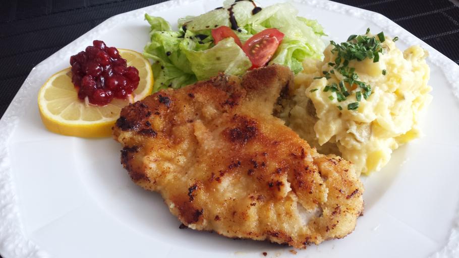 Keywords: sideburn pig baked potato salad potatoes green salad eat food iceberg lettuce nutrition delicious meat pan cook preparation tasty