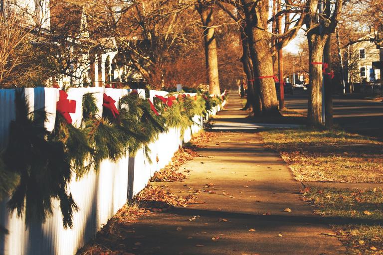Keywords: sidewalk path grass leaves white fence red ribbons trees street neighbourhood neighborhood sunny shadows