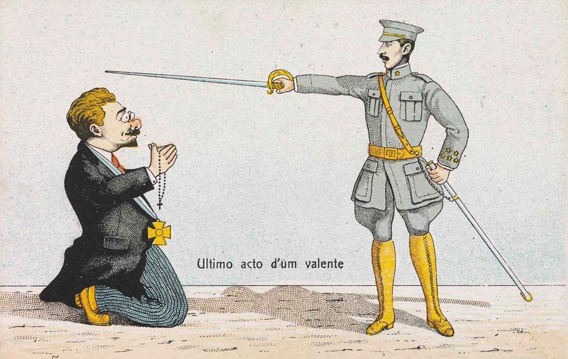 Keywords: Sidónio Pais derrota Afonso Costa - 1918.png pt Bilhete postal com ilustração colorida caricaturando a subida de Sidónio Pais ao poder - como ditador - afastando por via de um golpe militar o governo do Partido Democrático de Afonso Costa - este surgindo com uma condecoração fantasiosa cuja banda alude à Ordem de Nossa Senhora da Conceição de Vila Viçosa Em legenda «Ultimo acto d´um valente» en Postcard with caricature of Sidónio Pais's rise to power - as a dictator - ousting through a military coup Afonso Costa's Democratic Party government Costa is the figure on its knees to the left with a fanciful decoration an alusion the Order of the Immaculate Conception of Vila Viçosa The inscription reads «The final act of a brave man » 1918 http //casacomum org/cc/visualizador pasta 09022 002 088 Casa Comum - Fundação Mário Soares author other versions PD-old-70-1923 1918 in Portugal Sidónio Pais Afonso Costa Caricatures of politicians of Portugal Uploaded with UploadWizard |