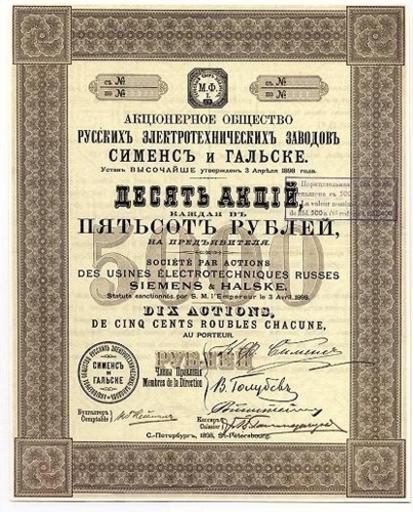 | Keywords: Siemens share 1809.jpg ru 10 акций общества Сименс-Гальске own 1898 Author PD-old-100 Original upload log ru wikipedia Siemens_share_1809 jpg wikitable - 2013-04-24 10 53 403500 249631 bytes DKP64 <nowiki> Изоб ажение Описание 10 акций общества Сименс-Гальске Источник собственная абота В емя создания 1809 Авто User DKP64 DK </nowiki> __NOTOC__ Siemens in Russia |