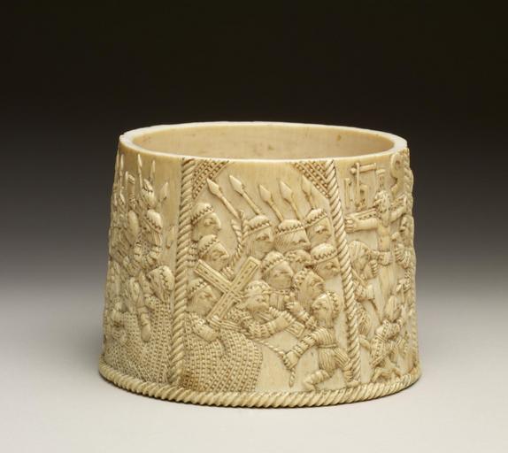 | Keywords: Sierra Leonian - Ivory Pyx with Scenes from the Passion of Christ - Walters 71108 - View C.jpg This pyx a container used in the Catholic Mass for the consecrated wafer has lost it cover The artist was an ivory carver of the Sapi people of coastal West Africa who was working on commission from a Portuguese trader who expected to sell such exotic objects to princely patrons in Europe The images of the Passion of Christ are taken from a contemporary European illustrated Bible Most of the works in ivory commissioned from West African carvers were for conspicuous display such as magnificent salt cellars for the tables of the wealthy but they all share the treasured characteristic of intricate surface design One Portuguese writing in the 16th century described these carvers as very ingenious and their objects wonderful to see The Sapi style of ivory carving is evident in the dense mass of figures and the textured linear design between 1490 1530 carved ivory cm 7 9 10 9 accession number 71 108 13267 Henry Walters Baltimore date and mode of acquisition unknown Walters Art Museum Henry Walters Acquired by Henry Walters 1492 An Ongoing Voyage The Library of Congress Washington 1992-1993 Encompassing the Globe Freer Gallery of Art Washington 2007 place of origin Sierra Leone Walters Art Museum license Passion of Christ pyx from Sierra Leone |