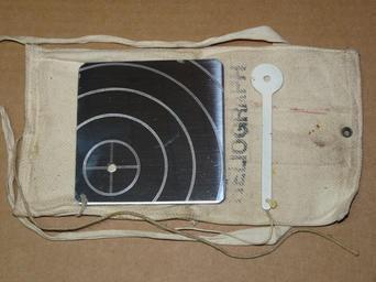 | Keywords: Signal Mirror British Dinghy Heliograph 4inch 1943.jpg en This British 1940s 4 x4 stainless steel mirror with attached foresight wand and cloth sachet case is an example of those commonly issued in British emergency kits in World War II They were developed in 1942-1943 so that downed pilots could signal to rescue planes and ships with reflected sunlight Such emergency mirrors are more likely to be termed signal mirrors or emergency signaling mirrors in non-Commonwealth countries or if they lack a foresight Signal mirrors are required lifeboat equipment in most countries and are provided in the survival kits of most military pilots Both the mirror and the painted wand are 14 gauge steel The mirror has a 1/4 diameter sighting hole countersunk from the rear and painted black to reduce reflections The foresight has a 7/8 diameter head with a 3/16 diameter sighting hole The case has separate pockets for the mirror and the wand The user held the wand in front of the mirror and sighted the target by looking through the rear of the mirror sighting hole and the wand sighting hole The user then centered the shadow of the mirror sighting hole on the foresight hole with the aid of the shadows cast by the scribed mirror lines on the foresight by tilting the mirror When the target was centered in the two sighting holes and the shadow of the mirror hole was centered on the foresight hole the mirror reflected sunlight on the target The prototype of this mirror and probably this mirror as well was made by George Ibberson Company General Machinists 146 West Street Sheffield 1 The testing of the prototype is described in the Report Heliograph mirrors for emergency dinghies Report No issued 28 February 1943 by the Marine Aircraft Experimental Establishment Helensburgh That report is in the British National Archives cataloged under AVIA 19/218 at http //www nationalarchives gov uk/catalogue/displaycataloguedetails asp CATLN 6 CATID 3074923 j 1 own Heliograph 2010-09-25 Cc-zero ImageNote 1 2426 570 356 1491 3648 2736 2 Foresight ImageNoteEnd 1 ImageNote 2 2540 707 114 119 3648 2736 2 Foresight Sighting Hole ImageNoteEnd 2 ImageNote 3 1035 1564 105 137 3648 2736 2 Mirror Sighting Hole countersunk from rear with countersink painted black to reduce reflections ImageNoteEnd 3 ImageNote 4 739 588 1477 1414 3648 2736 2 Mirror 4 x4 14 gauge stainless steel with sighting hole and scribe marks ImageNoteEnd 4 ImageNote 5 3279 1167 187 223 3648 2736 2 Eyelet for round-section closing tie cord ImageNoteEnd 5 ImageNote 6 1797 2175 360 91 3648 2736 2 Tether connecting foresight and mirror ImageNoteEnd 6 ImageNote 7 2841 2207 689 301 3648 2736 2 Tie cord to close cloth sachet case securely by threading through eyelet above it ImageNoteEnd 7 ImageNote 8 41 255 2859 196 3648 2736 2 One of two cloth ties typically used to secure the closed case around the centre and tied in a bow The other tie is below the mirror ImageNoteEnd 8 Heliographs Signalling mirrors Taken with Panasonic Lumix DMC-FZ28 |