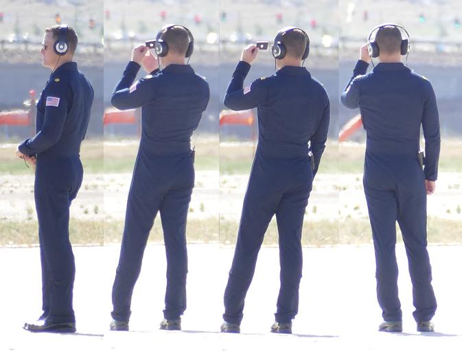 Keywords: signal mirror signalmirror thunderbird 9 thunderbird9 thunderbirds usaf thunderbirds usafthunderbirds airshow outdoor Here's a composite view of Thunderbird 9 tracking Thunderbird 1 with a signal mirror, facing away from the audience. Maj. (Dr.) Chris Scheibler, Thunderbird 9, using a signal mirror to mark show center for Thunderbird 1 during the USAF Thunderbirds' aerial performance at the "Thunder over the Empire" airshow at March Air Reserve Base in Riverside County, CA on April 17, 2016. Step 1: Reflect mirror light on other hand (this lets Thunderbird 9 locate the "fireball" aiming aid). Step 2: Using the mirror. Step 3: Waiting for the next pass. I'm releasing this photo to the public domain under the CC0 license. If you want to reuse it, you may want to start with the full resolution version, here. Here's a composite view of Thunderbird 9 tracking Thunderbird 1 with a signal mirror, facing away from the audience. Maj. (Dr.) Chris Scheibler, Thunderbird 9, using a signal mirror to mark show center for Thunderbird 1 during the USAF Thunderbirds' aerial performance at the "Thunder over the Empire" airshow at March Air Reserve Base in Riverside County, CA on April 17, 2016. Step 1: Reflect mirror light on other hand (this lets Thunderbird 9 locate the "fireball" aiming aid). Step 2: Using the mirror. Step 3: Waiting for the next pass. I'm releasing this photo to the public domain under the CC0 license. If you want to reuse it, you may want to start with the full resolution version, here. |