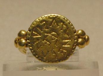 | Keywords: Signet ring Louvre MAN87432.jpg Signet ring bearing a monogram interpreted as REGINE ARNEGUNDIS Queen Aregund Gold Merovingian Gaul ca 570 From the finery of Aregund wife of Clotaire I 511 “561 Found in 1959 in a tomb in Saint-Denis France Bague sigillaire portant un monogramme interprĂ©tĂ© comme « REGINE ARNEGUNDIS » Reine Arnegonde Or Gaule mĂ©rvingienne vers 570 Provient de la parure d'Arnegonde femme de Clotaire Ier 511-561 DĂ©couvert en 1959 dans une tombe Ă Saint-Denis Museum Louvre Department of Decorative Arts Richelieu first floor room 1 object history credit line On deposit from the French Museum of Monuments DĂ©pĂ´t du MusĂ©e des monuments français accession number MAN 87432 Jastrow 2005 other versions <gallery> Image Belt Arnegund MAN87431 jpg Aregund's finery set belt Image Fibulae Aregund MAN87424 jpg Aregund's finery set fibulae </gallery> Decorative arts in the Louvre - Room 1 Merovingian jewellery Signet rings Louvre images of low quality ArĂ©gonde Jewellery in the Louvre |