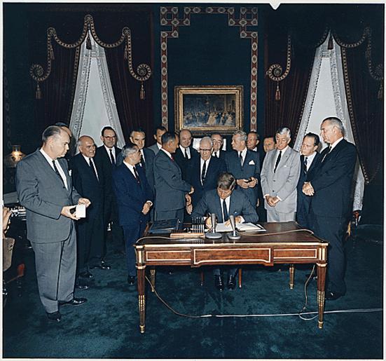 Keywords: nara:arcid=194230 u.s. national archives usnationalarchives today's document todaysdocument october signing of the nuclear test ban treaty signingofthenucleartestbantreaty Title: Signing of the Nuclear Test Ban Treaty, 10/07/1963 Creator(s): President (1961-1963 : Kennedy). Office of the Naval Aide to the President. (1961 - 1963) Persistent URL: arcweb.archives.gov/arc/action/ExternalIdSearch?id=194230 President Johnson. (second row) unidentified man, Senator Mike Mansfield, John J. McCloy, unidentified man, W. Averell Harriman, Senator George Smathers, Secretary of State Dean Rusk, Senator Hubert Humphrey, William C. Foster, Senator Howard W. Cannon. White House, Treaty Room. (ARC ID 194230); Series: Robert Knudsen White House Photographs, 01/20/1961 - 12/19/1963; Collection JFK-WHP: White House Photographs, 12/19/1960 - 03/11/1964; John F. Kennedy Library (NLJFK); National Archives and Records Administration. Access Restrictions: Unrestricted Use Restrictions: Unrestricted Title: Signing of the Nuclear Test Ban Treaty, 10/07/1963 Creator(s): President (1961-1963 : Kennedy). Office of the Naval Aide to the President. (1961 - 1963) Persistent URL: arcweb.archives.gov/arc/action/ExternalIdSearch?id=194230 President Johnson. (second row) unidentified man, Senator Mike Mansfield, John J. McCloy, unidentified man, W. Averell Harriman, Senator George Smathers, Secretary of State Dean Rusk, Senator Hubert Humphrey, William C. Foster, Senator Howard W. Cannon. White House, Treaty Room. (ARC ID 194230); Series: Robert Knudsen White House Photographs, 01/20/1961 - 12/19/1963; Collection JFK-WHP: White House Photographs, 12/19/1960 - 03/11/1964; John F. Kennedy Library (NLJFK); National Archives and Records Administration. Access Restrictions: Unrestricted Use Restrictions: Unrestricted |