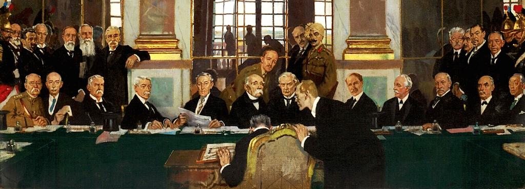 | Keywords: Signing of Peace in the Hall of Mirrors (fragment).png Artwork en The Signing of Peace in the Hall of Mirrors Versailles 28th June 1919 fragment 1919 oil canvas cm http //www iwm org uk/collections/item/object/20780 Imperial War Museum Creator William Orpen A view of the interior of the Hall of Mirrors at Versailles with the heads of state sitting and standing before a long table Front Row Dr Johannes Bell Germany signing with Herr Hermann Muller leaning over him Middle row seated left to right General Tasker H Bliss Col E M House Mr Henry White Mr Robert Lansing President Woodrow Wilson United States ; M Georges Clemenceau France ; Mr D Lloyd George Mr A Bonar Law Mr Arthur J Balfour Viscount Milner Mr G N Barnes Great Britain ; The Marquis Saionzi Japan Back row left to right M Eleutherios Venizelos Greece ; Dr Affonso Costa Portugal ; Lord Riddell British Press ; Sir George E Foster Canada ; M Nikola Pachitch Serbia ; M Stephen Pichon France ; Col Sir Maurice Hankey Mr Edwin S Montagu Great Britain ; the Maharajah of Bikaner Major-General Sir Ganga Singh India ; Signor Vittorio Emanuele Orlando Italy ; M Paul Hymans Belgium ; General Louis Botha South Africa ; Mr W M Hughes Australia PD-old-auto 1931 The Signing of Peace in the Hall of Mirrors Collections of the Imperial War Museum |
