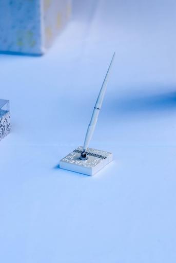 Keywords: signing pen wedding ceremony table autograph guest guests decor white decorations happy joy blessing visitors feather pencil