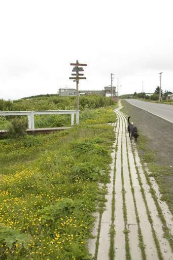 View Original:Signpost at the crossroads with dog by road.jpg (2000x3000)