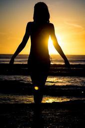 Keywords: silhouette beach sun sunset summer sea young girl female woman outdoor dusk sand