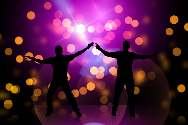 Keywords: silhouette men gay love relationship joy fun movement jump light laser light show colorful light beam color rays darkness lighting party music light effects ray optics evening artificial light dance disco nightclub celebrate dancers human lust for life joy of life blue club night club dance bar dance club mood dance floor