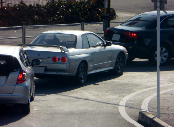 Keywords: Silver Nissan SKYLINE GT-R (BNR32) rear.JPG ja 色のBNR32型日産・スカイラインGT-Rをリアから撮影 2014-11-24 10 32 45 own Tokumeigakarinoaoshima other versions cc-zero Uploaded with UploadWizard Nissan Skyline R32 GT-R Silver coupes