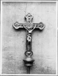 | Keywords: Silver processional crucifix at Mission San Carlos, Monterey, ca.1900 (CHS-4090).jpg  en <br> Silver processional crucifix at Mission San Carlos Monterey ca 1900 Photograph of the front of a silver processional crucifix at Mission San Carlos Monterey ca 1900 The figure of Christ looks down to his right Stylized flames drops or leaves radiate from the intersection of the vertical and horizontal arms of the cross A rosette appears at the center The ends are each shaped like three intersecting arcs The cross is on a stand and a stone wall is behind the cross At the presidio chapel Photoprint reads Born before the sainted Serra Call number CHS-4090 Legacy record ID chs-m16597; USC-1-1-1-14075 Photographer James George Wharton Filename CHS-4090 Coverage date circa 1900 Part of collection California Historical Society Collection 1860-1960 Type images; physical objects Geographic subject city or populated place Carmel Repository name USC Libraries Special Collections Accession number 4090 Microfiche number 1-126-7 Archival file chs_Volume96/CHS-4090 tiff Part of subcollection Title Insurance and Trust and C C Pierce Photography Collection 1860-1960 Repository address Doheny Memorial Library Los Angeles CA 90089-0189 Geographic subject country USA Format aacr2 3 photographs glass photonegative photoprints b w ; 22 x 17 cm Rights Digitally reproduced by the USC Digital Library; From the California Historical Society Collection at the University of Southern California Subject adlf religious facilities Project USC Repository email specol usc edu Contributing entity California Historical Society Date created circa 1900 Publisher of the digital version University of Southern California Libraries Format aat photographic prints; photographs Geographic subject state California Subject file heading Missions -- Mission Carmel San Carlos Borromeo de Carmelo ; Mission Carmel -- San Carlos Borromeo de Carmelo Format glass plate negatives Access conditions Send requests to address or e-mail given Phone 213 821-2366; fax 213 740-2343 Geographic subject county Monterey Subject lcsh Missions Spanish Subject Carmel Mission; Mission Carmel; Mission San Carlos; Mission San Carlos Monterey circa 1900 date created James George Wharton http //digitallibrary usc edu/cdm/ref/collection/p15799coll65/id/16533 PD-old-70-1923 Images from USC Digital Library uploaded by Fæ California Historical Society Collection 1860-1960 Glass plate negatives Photographs by George Wharton James Mission San Carlos Borromeo de Carmelo |