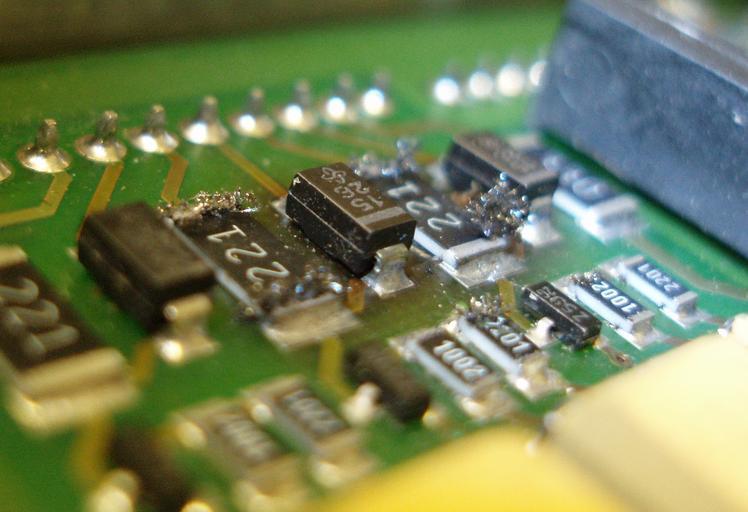 Keywords: SilverSulfideWhiskers1.jpg Silver Sulfide Whiskers growing out of surface-mount resistors from a Moog DS2000 servodrive Own 2009-05-20 JonathonReinhart Whiskers metal Surface mount technology