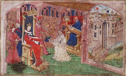 Keywords: Simon de Hesdin presents his translation of Valerius Maximus' 'Facta et dicta memorabilia' to Charles V, king of France.jpg en Simon de Hesdin presents his translation of Valerius Maximus' 'Facta et dicta memorabilia' to Charles V king of France Contents Valerius Maximus Des faits et dits mémorables Books I-VII Translation from the Latin by Simon de Hesdin Place of origin date France; 1462 Material Vellum ff 314 368x274 287x205 mm 41 lines littera cursiva Binding 18th-century brown leather; gilt on spine Decoration 8 two-column miniatures 105x139 mm ; 1 column miniature 126x85 mm ; decorated initials with border decoration ff 1r 77r 154r 188v 197v etc Provenance Philippe de Rubempr d c 1710 Georges Joseph G rard 1734-1814 of Brussels; purchased in 1818 by the Dutch Government with the Gérard collection and placed in the Algemeen Rijksarchief now Nationaal Archief at The Hague; transferred to the KB in 1832 G rardno A 21 http //manuscripts kb nl/show/manuscript/71+D+42 Valerius Maximus Des faits et dits mémorables Books I-VII Translation from the Latin by Simon de Hesdin Author 1462 Charles V of France Simon de Hesdin Valerius Maximus Ermine clothing in art Manuscripts from Koninklijke Bibliotheek PD-old-100 |