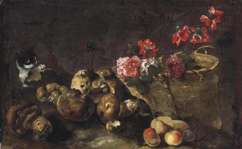 | Keywords: Simone del Tintore (Attr.) - Still Life with Mushrooms, Fruit, a Basket of Flowers and a Cat.jpg Attributed to Other date before 1708 Oil on canvas Size cm 55 9 90 2 place of discovery object history exhibition history credit line Auctioned at Sotheby's on 28 January 2011 in New York lot 18 accession number place of creation http //www sothebys com/en/auctions/ecatalogue/2011/old-master-19th-century-european-art-n08715/lot 18 html PD-old-auto-1923 1681 Simone del Tintore Still-life paintings of fruits Still-life paintings of cats |