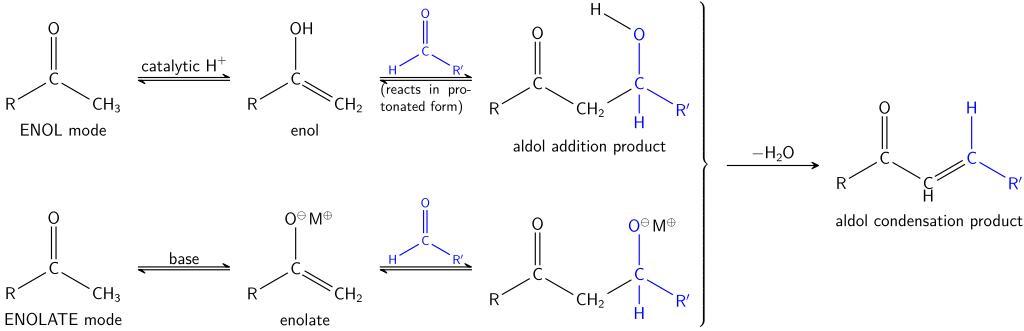 | Keywords: Simple aldol reaction.svg aldol reaction including the aldol condensation The scheme shows both enol and enolate modes of addition own Krishnavedala 2014-08-12 validSVG LaTeX source code 250px <syntaxhighlight lang latex > \documentclass12pt border 1pt crop multi false tikz standalone \usepackageT1 fontenc \usepackageutf8 inputenc \usepackage chemfig chemmacros \usepackage lmodern \usetikzlibrary decorations pathmorphing \chemsetupchemformula font-shape sf format \sffamily \renewcommand \familydefault \sfdefault \renewcommand \printatom1 \ensuremath \mathsf 1 \setatomsep 3em \setdoublesep 6ex \setarrowdefault 1 5 thick \setbondstyle thick \makeatletter \begin document \definesubmol\nobond - 0 25 draw none \schemestartnorth \chemleft \subscheme \chemname \chemfig R- 30C 2O - -30CH_3 ENOL mode \arrow < >catalytic \ch H+ \chemname \chemfig R- 30C -2OH -30CH_2 enol \arrow < > \chemfigbluescale 0 75 H- 30C 2O - -30R' \parbox 2 25cm \footnotesize reacts in protonated form \chemname \chemfig R- 30C 2O - -30CH_2- 30 \textcolor blue C -2 blue\textcolor blue O - 150H -6 75 blue\textcolor blue H - -30 blue\textcolor blue R' aldol addition product \arrow c4-- 0 -90 75 \chemfig R- 30C 2O - -30CH_2- 30 \textcolor blue C -2 1 blue\textcolor blue O \ominus - 5 draw noneM \oplus -6 75 blue\textcolor blue H - -30 blue\textcolor blue R' \arrow < > \chemfigbluescale 0 75 H- 30C 2O - -30R' -180 \chemname \chemfig R- 30C -2 1O \ominus - 5 draw noneM \oplus -30CH_2 enolate \arrow < >base 180 \chemname \chemfig R- 30C 2O - -30CH_3 ENOLATE mode \chemright\ \arrow -> - \ch H2O \chemname \chemfig R- 30C 2O - -30C -6 25 draw none H 30 \textcolor blue C -2 blue\textcolor blue H - -30 blue\textcolor blue R' aldol condensation product \schemestop \end document </syntaxhighlight> cob Aldol condensation Aldol reaction Cc-zero |
