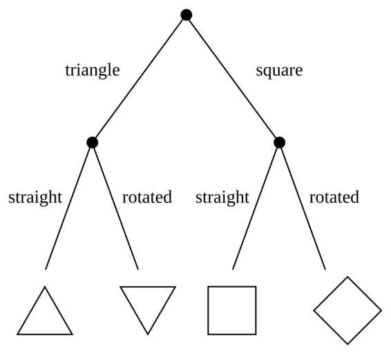 | Keywords: Simple decision tree.svg Inkscape en A decision tree for four shapes Based on a figure from cite journal The physics of forgetting Landauer ™s erasure principle and information theory M B Plenio V Vitelli Contemporary Physics 2001 42 1 26 the caption of which says An example of a decision tree Two binary choices have to be made to identify the shape triangle or square and the orientation horizontal or rotated In sending with equal probability one of the four objects one therefore transmits 2 bits of information 2013-04-02 own Eviatar Bach cc-zero Uploaded with UploadWizard Binary decision diagrams Files by User InverseHypercube Information theory |