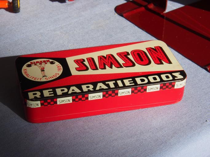 Keywords: Simson reparatiedoos pic1.JPG Simson reparatiedoos own 2012-08-19 09 50 49 AlfvanBeem CC-zero Trademarked Tire Repair tins Nostalgia by Alf van Beem Classic vehicle photographs by Alf van Beem