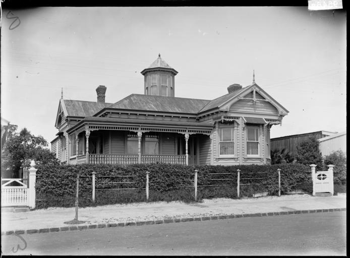 | Keywords: blackandwhite monochrome architecture photo border building outdoor black and white A large single-storied wooden villa with a tower. It has a corrugated iron roof, two chimneys and a verandah on two sides. There is metal fence on the street frontage with a hedge growing up through it. On the right is a decorative gate. On the righthandside (on the neighboruring property) is a large shed. A young tree is growing near the roadside. Photograph taken by William A Price ca 1910. Quantity: 1 b&w original negative(s). Physical Description: Dry plate glass negative 4.75 x 6.5 inches Single-storied villa with tower. Price, William Archer, 1866-1948 :Collection of post card negatives. Ref: 1/2-001222-G. Alexander Turnbull Library, Wellington, New Zealand. natlib.govt.nz/records/22895259 A large single-storied wooden villa with a tower. It has a corrugated iron roof, two chimneys and a verandah on two sides. There is metal fence on the street frontage with a hedge growing up through it. On the right is a decorative gate. On the righthandside (on the neighboruring property) is a large shed. A young tree is growing near the roadside. Photograph taken by William A Price ca 1910. Quantity: 1 b&w original negative(s). Physical Description: Dry plate glass negative 4.75 x 6.5 inches Single-storied villa with tower. Price, William Archer, 1866-1948 :Collection of post card negatives. Ref: 1/2-001222-G. Alexander Turnbull Library, Wellington, New Zealand. natlib.govt.nz/records/22895259 |