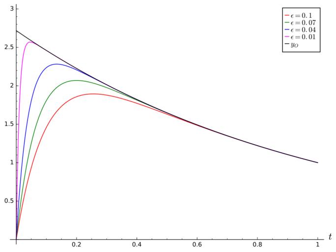 | Keywords: Singular perturbation convergence.svg singular perturbation solutions Shows solutions to <math> \epsilon y + 1+\epsilon y' + y 0 \ </math> with <math>y 0 0</math> <math>y 1 1</math> for varying <math>\epsilon</math> Created with the following Sage code <source lang python> var 't' var 'eps' y t exp -t - exp -t/eps / exp -1 - exp -1/eps yO t exp 1 - t combined plot y subs eps 0 1 t 0 1 color 'red' legend_label ' \epsilon 0 1 ' + plot y subs eps 0 07 t 0 1 color 'green' legend_label ' \epsilon 0 07 ' + plot y subs eps 0 04 t 0 1 color 'blue' legend_label ' \epsilon 0 04 ' + plot y subs eps 0 01 t 0 1 color 'magenta' legend_label ' \epsilon 0 01 ' + plot yO t 0 1 color 'black' legend_label ' y_O ' combined set_legend_options shadow False combined show ymax 3 axes_labels ' t ' </source> 2016-11-05 own Eviatar Bach other versions Created with Sage cc-zero Differential equations Asymptotics Images with Sage source code |