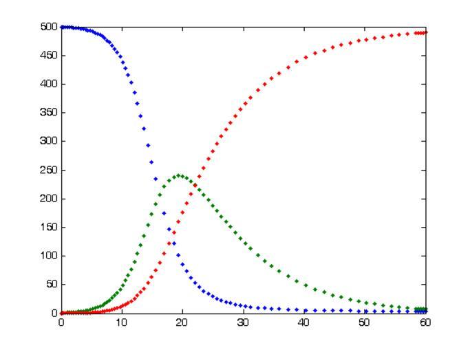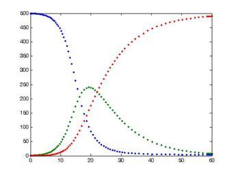 | Keywords: Sirsys-p9.png  Colors are believed to be Blue Susceptible Green Infected and Red Recovered <br> An epidemiological graph for the SIR model S represents the number of susceptibles I the number of infectious people and R the number of recovered Graph generated using MATLAB code 2006-06-06 own assumed Bye~commonswiki sirsys m program <pre> beta 0 001;v 0 1; ; before modified beta 0 005,v 0 05, the figure produced by running this program in matlab is different with Fig Sirsys-p9 png so let beta 0 001 v 0 1 and try again then the resoult is right options odeset 'RelTol' 1e-4 'AbsTol' 1e-4 ; T Y ode45 sirsys1 0 60 500 1 0 options beta v ; plot T Y 1 ' ' T Y 2 ' ' T Y 3 ' ' </pre> sirsys1 m function <pre> function dy sirsys1 t y beta v dy zeros 3 1 ; dy 1 -beta y 1 y 2 ; force of infection lambda beta y 2 dy 2 beta y 1 y 2 -v y 2 ; dy 3 v y 2 ; </pre> Epidemics |