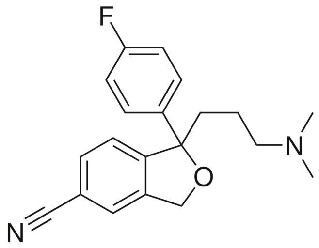 Keywords: Sitalopram.svg en 2D structure of SSRI-class antidepressant citalopram Own Harbin 2008-12-19 Citalopram Citalopram skeletal formula.svg en 2D structure of SSRI-class antidepressant citalopram Own Harbin 2008-12-19 Citalopram