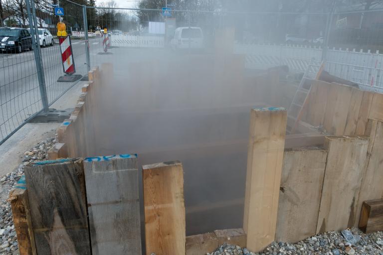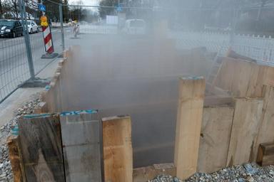 Keywords: site district heating steam water vapor leak repair wood planks shaft auto stadtwerke construction fence warning beacon