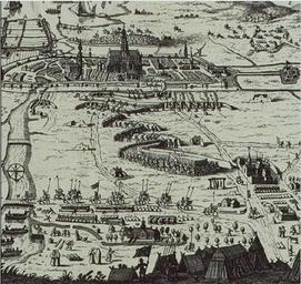 Keywords: Situatie schets van dolhuys ten tijde van beleg van haarlem.JPG en Detail of a situation sketch of the siege of Haarlem in 1572-3 The sketch is taken from the perspective of the Spanish camp at Huis ter Kleef It is a bird's eye view of Haarlem as seen from the North On the left is the Spaarne river and on the right of the road to Haarlem is the Dolhuys complex where Willem Janszoon Verwer was regent and wrote his diary Clearly visible to the left of the Dolhuys is the gallows Beschrijvinge ende Lof der Stad Haerlem / S Ampzing - Haarlem 1628 North Holland Archives Willem Outgersz Akersloot 1628 PD-old-100 Het Dolhuys in Haarlem Siege of Haarlem Samuel Ampzing |