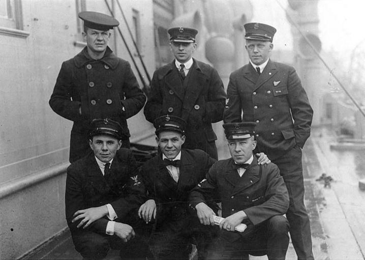 | Keywords: Six crew members of R-38 aboard SS Princess Matoika.jpg British airship R-38 U S Navy ZR-2 Six U S Navy Petty Officers sail to speed up work on the R-38 The R-38 is nearing completion in England and is to be flown to her hangar at Lakehurst N J quoted from the original caption They are on board the passenger liner Princess Matoika formerly USS Princess Matoika for the trip to England These men are identified in the original caption as left to right front J W Cullinan M Lay and I L Thomas left to right standing N Julnis sic A B Galation and H Christensen Chief Boatswain's Mate M Lay and Chief Machinist's Mate W A Julius were among those who lost their lives when the R-38 crashed on 24 August 1921 U S Naval Historical Center Photograph http //www history navy mil/photos/images/h41000/h41997 jpg U S Naval Historical Center Photo NH 41997 ca 1921 U S Navy PD-USGov-Military-Navy USS Princess Matoika ID-2290 |