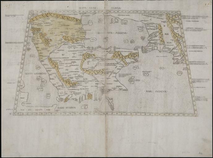 | Keywords: Sixth Map of Asia WDL2702.png  Artwork ru Птолемей II век fr Ptolémée IIe siècle en Ptolemy 2nd century zh 托勒密 2 世纪 pt Ptolomeu Século II ar بطليموس القرن الثاني es Ptolomeo siglo II ru Шестая ка та Азии fr Sixième carte d'Asie en Sixth Map of Asia zh 第六幅亚洲 图 pt Sexto Mapa da Ásia ar الخريطة السادسة لآسيا ru Геог афия Птолемея пе еведенных на латинский язык с г еческого о игинала были опубликованы в Ев опе в XV веке Данная ка та  из издания 1478 года опубликованного в Риме Атласы Птолемея включают в себя 12 ка т Азии  а Шестой ка те Азии изоб ажен весь А авийский полуост ов Общие конту ы на этой ка те весьма схематичны однако многие геог афические объекты в том числе К асное мо е Индийский океан и  азличные геог афические особенности полуост ова четко узнаваемы <br>А авийский залив; А авийский полуост ов; Пе сидский залив fr Plusieurs éditions de l'œuvre de la <em>Geographia</em> Géographie de Ptolémée traduites en latin à partir à partir de l'original grec ont été publiées en Europe au XVe siècle Cette carte provient de l'édition de 1478 publiée à Rome Les atlas ptolémaïques comprennent 12 cartes de l'Asie La Sixième carte de l'Asie couvrait la péninsule arabique Les contours de cette carte sont rudimentaires mais beaucoup d'éléments géographiques dont la mer Rouge l'océan Indien et d'autres caractéristiques de la péninsule sont clairement reconnaissables <br>Golfe Arabique; Péninsule arabique; Golfe Persique en Several editions of Ptolemy s <em>Geographia</em> Geography translated into Latin from the original Greek were published in Europe in the 15th century This map is from the 1478 edition which was published in Rome Ptolemaic atlases included 12 maps of Asia The Sixth Map of Asia covered the Arabian Peninsula The outlines of this map are crude but many geographic features including the Red Sea the Indian Ocean and different features of the peninsula are clearly recognizable <br>Arabian Gulf; Arabian Peninsula; Persian Gulf zh 几个版 的托勒密  理学指南   理学 , 从原希腊文翻译为拉丁文,并于 15 世纪 欧洲出版  这幅 图是 罗马出版的 1478 年的版   托勒密 图册包括 12 幅亚洲 图  亚洲第六幅 图 涵盖了阿拉伯半岛   图的轮廓比较粗糙,但众多 理特征包括红海 印度洋以及半岛的不同特点 十分清晰  <br>阿拉伯湾; 阿拉伯半岛; 波斯湾 pt <em>Geografia</em> traduzida para o Latim do original Grego foi publicado na Europa no século XV Este mapa da edição 1478 a qual foi publicada em Roma Os atlas ptolemaicos incluem 12 mapas da Ásia O Sexto Mapa da Ásia cobre a Península Arábica As linhas deste mapa são toscas mas muitas características geográficas incluindo o Mar Vermeho o Oceano Índico e diferentes características da península podem ser claramente reconhecidas <br>Golfo Arábico; Península Arábica; Golfo Pérsico ar إن العديد من طبعات <em>جيوغرافيا</em> الجغرافيا لبطليموس التي ترجمت من اليونانية الأصلية إلى اللاتينية، نُشرت في أوروبا في القرن الخامس عشر وقد وردت هذه الخريطة في طبعة 1478،التي نشرت في روما وقد اشتملت أطالس بطليموس على 12خريطة لآسيا واشتملت خريطة آسيا السادسة على شبه الجزيرة العربية ورغم أن الخطوط العريضة لهذه الخريطة غير متقنة، فإن الكثير من المعالم الجغرافية، بما فيها البحر الأحمر، والمحيط الهندي، وملامح مختلفة من شبه الجزيرة يمكن التعرف عليها بوضوح <br>الخليج العربي; شبه الجزيرة العربية; الخليج الفارسي es Varias ediciones de la <em>Geographia</em> Geografía de Ptolomeo traducidas al latín del griego original se publicaron en Europa en el siglo XV Este mapa pertenece a la edición de 1478 que se publicó en Roma Los atlas de Ptolomeo incluyen 12 mapas de Asia El Sexto mapa de Asia abarcaba la Península Arábiga Los contornos de este mapa son toscos pero muchos de los accidentes geográficos incluyendo el Mar Rojo el océano Índico y otros accidentes de la península son claramente reconocibles <br>Golfo Arábigo; Península de Arabia; Golfo Pérsico 1478 ru Ка ты fr Cartes en Maps zh  图 pt Mapas ar خرائط es Mapas en 1 map; 26 x 47 centimeters ru  ациональная библиотека Ката а fr Bibliothèque nationale du Qatar en Qatar National Library zh 卡塔尔国家图书馆 pt Biblioteca Nacional do Catar ar مكتبة قطر الوطنية es Biblioteca Nacional de Catar object history exhibition history credit line place of creation ru И ак fr Irak en Iraq zh 伊拉克 pt Iraque ar العراق es Irak Original language title Sexta Asiae tabula http //dl wdl org/2702 png Gallery http //www wdl org/en/item/2702/ accession number PD-Art PD-old-100 Maps of the Arabian Peninsula Persian Gulf Images uploaded by Fæ Maps from the World Digital Library Ptolemaic middle east |