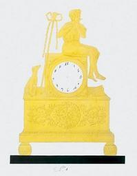 Keywords: Sketch of a French Empire style clock. Orpheus.jpg en Watercolour gouache and pen and ink on laid paper Numbered 1 Dimensions 50 4 cm by 33 cm To be executed in gilt bronze; enamel dial; black marble platform A figure of a shepherd boy playing a flute while seated on a plinth against which he has rested his staff and fronted by the clock dial his dog and syrinx to either side; the frieze decorated with a flower wreath and anthemion motifs; on ball feet The presence here of a syrinx panpipes and shepherd ™s staff indicates the theme of this clock as Orpheus ™s love for Eurydice one of the greatest tales of love and faithfulness in the Ancient canon Orpheus a Thracian poet famed for his musical skill is shown with a laurel crown won on account of his playing; indeed it was so good that he charmed the beasts and even the trees and rocks around him On the death of his great love Eurydice who was killed stepping on a snake Orpheus journeyed to Hades the kingdom of the Underworld and by the charm of his music persuaded Pluto god of Hades to let him take Eurydice back to earth on the condition that he did not look at her until they had arrived in the Upper World This he resisted until the very last moment turning to see her cry out as she vanished forever Despite such an ending the purpose of the portrayal in this clock is to celebrate Orpheus ™ undying faithfulness to Eurydice as personified by the faithful dog by his side making it a suitable clock for a boudoir http //watercolours-drawings com/details asp subGalID 5 index 23 author between 1814 1820 PD-Art French Empire style mantel clock Sketches |