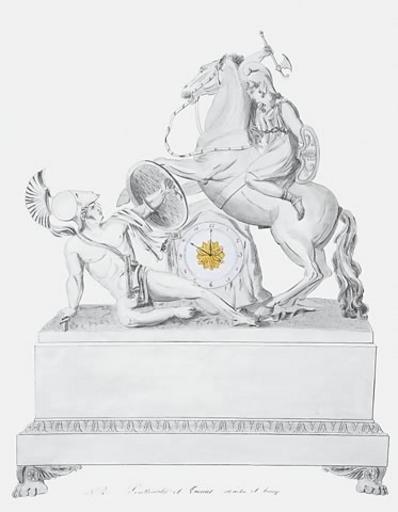 | Keywords: Sketch of a French Empire style clock. Penthesilea and a warrior.jpg  en Watercolour gouache and pen and ink on laid paper Inscribed Penthesilé et Guerrier; marbre et bronze Penthesilea and a warrior; marble and bronze Numbered 2 Dimensions 73 cm by 54 6 cm To be executed in statuary marble; enamel dial with gilt bronze center The queen helmeted and with a pelta shield wielding an axe mounted on a horse rearing over a cowering helmeted warrior with uplifted circular shield nude except for his sword scabbard and a loin drapery in the center a rocky outcrop containing the clock As recounted in Homer ™s Odyssey Penthesilea Queen of the Amazons came with a band of female warriors to the aid of besieged Troy The Amazons were famed for their valour in battle and the fear they inspired by their war cry Penthesilea slew many of the bravest Greek warriors laying siege to Troy but was herself finally slain by the Greek hero Achilles However once he saw her beauty and youth face to face having bent over his fallen foe Achilles regretted killing her http //watercolours-drawings com/details asp subGalID 5 index 21 author circa 1820 PD-Art French Empire style mantel clock Sketches Pelta Women at war |
