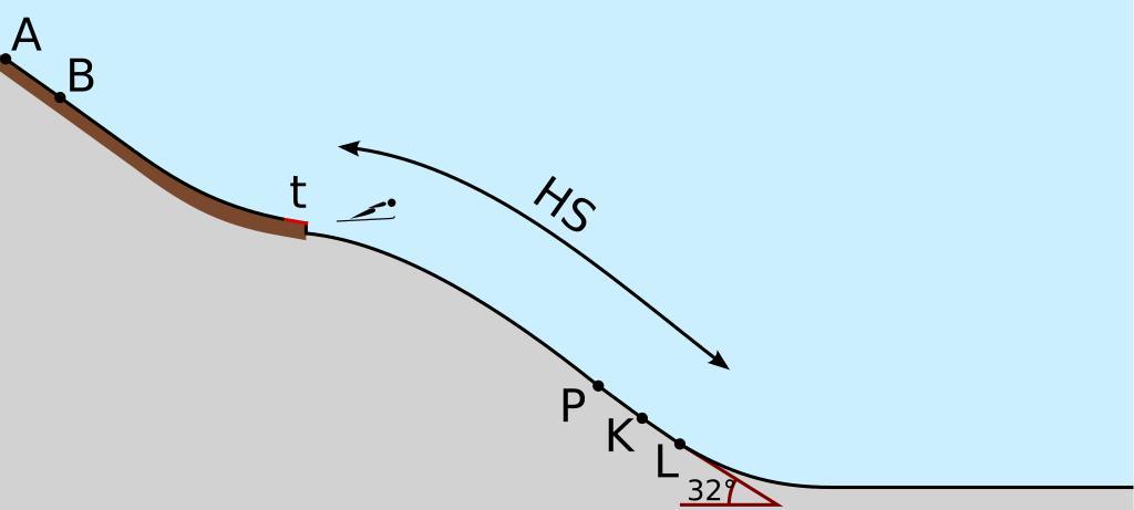 Keywords: Ski jumping hill profile.svg fr <br /> A point supérieur du départ<br /> B point inférieur du départ<br /> t table<br /> P début de la zone d ™atterrissage<br /> K point de construction<br /> L fin de la zone d ™atterrissage<br /> HS taille du tremplin hill size 2013-03-23 17 55 58 own Florn88 cc-zero Uploaded with UploadWizard Ski jumping hills |