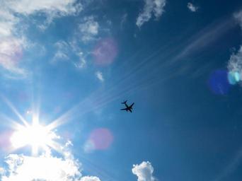 Keywords: sky sun blue clouds aircraft rays