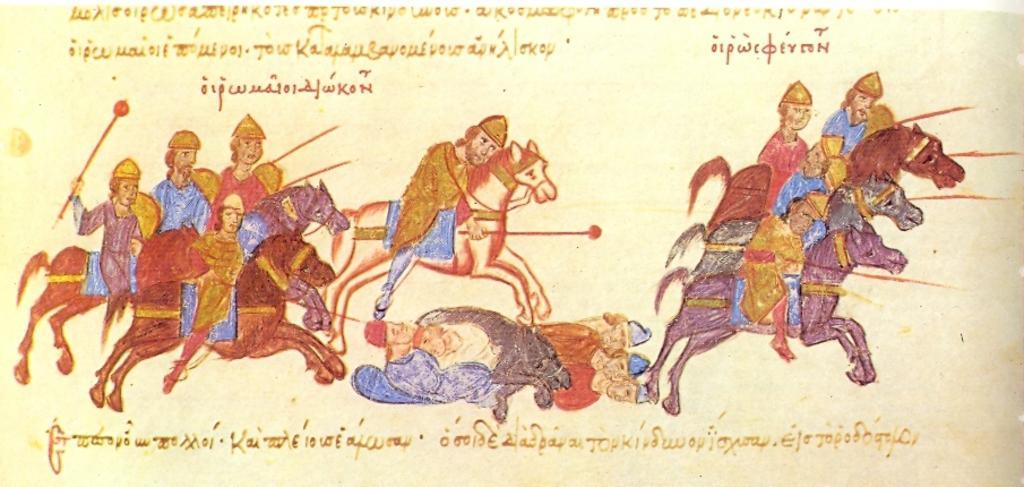 | Keywords: Skylintzes+Byzantine Rus conflict.jpg en Byzantine-Rus conflict during Sviatoslav's campaign in Bulgaria el Βυζαντινο ρωσική σύρραξη κατά την εκστρατεία του Σβιατοσλάβου στην Βουλγαρία Chronicle of John Skylitzes cod Vitr 26-2 fol 167r Ioannis Skylitzis 12th-13th century PD-old Madrid Skylitzes Byzantine cavalry |