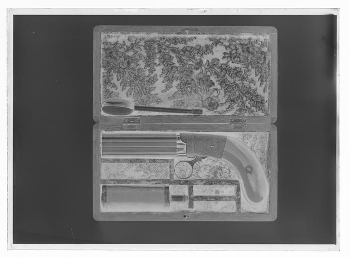 Keywords: Slaglåsrevolver, sexpipig, s.k - Livrustkammaren - 34840-negative.tif Pipknippe av brunerat stål sex slätborrade pipor vid mynningen stämplat 8 Axelskruv med blånerat huvud I bakänden inskruvat blånerade tändhattsnipplar <br/><br/>Rund låda av brunerat stål med graverad rankdekor på ovansidan oval stämpel text MOLANDER // MOTALA Ursprungligen blånerad ringformig avtryckare blånerad hake som spänner det blånerade slagstycket placerat på undersidan framför avtryckaren Låsdelar och kolvram stämplade 8 På lådans v sida ett lock som kan avlägsnas när kolvplattan tagits bort <br/><br/>Rundad böjd kolv med ram i ett med lådan graverad rankdekor på ryggen på änden en stjärna Kolvplattor av valnöt fästade med skruv från v sida Blånerade skruvplattor original caption ca 1850 steel e127 - eldvapen - pipa lås och stockbeslag material stål - walnut e3 - eldvapen - stock material valnöt size mm 199 size mm 87 pipa size mm 90 g 600 LRK MOLANDER MOTALA N A Molander place of origin original filename LN_B03074_005954 40931 inventory number LRK 4347 34840 CC0 Slaglåsrevolver sexpipig s k - Livrustkammaren - 34840 tif |
