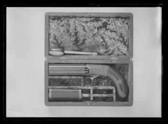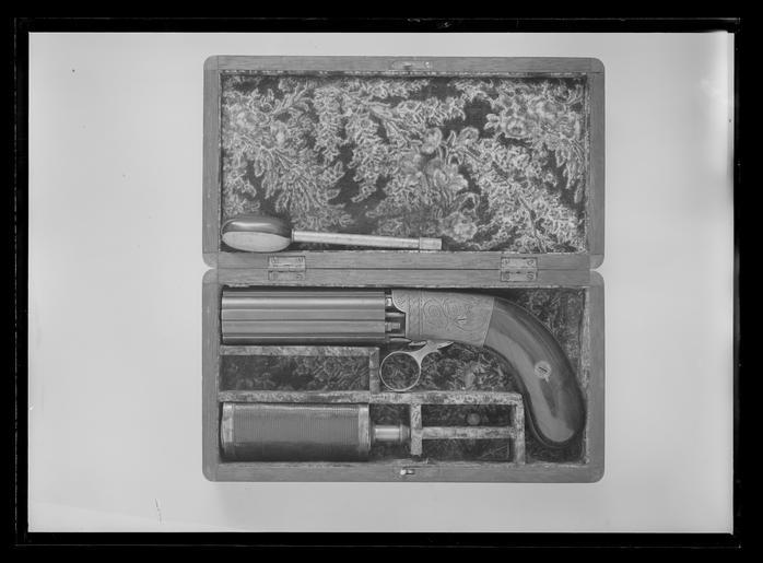 Keywords: Slaglåsrevolver, sexpipig, s.k - Livrustkammaren - 34840.tif Pipknippe av brunerat stål sex slätborrade pipor vid mynningen stämplat 8 Axelskruv med blånerat huvud I bakänden inskruvat blånerade tändhattsnipplar <br/><br/>Rund låda av brunerat stål med graverad rankdekor på ovansidan oval stämpel text MOLANDER // MOTALA Ursprungligen blånerad ringformig avtryckare blånerad hake som spänner det blånerade slagstycket placerat på undersidan framför avtryckaren Låsdelar och kolvram stämplade 8 På lådans v sida ett lock som kan avlägsnas när kolvplattan tagits bort <br/><br/>Rundad böjd kolv med ram i ett med lådan graverad rankdekor på ryggen på änden en stjärna Kolvplattor av valnöt fästade med skruv från v sida Blånerade skruvplattor original caption ca 1850 steel e127 - eldvapen - pipa lås och stockbeslag material stål - walnut e3 - eldvapen - stock material valnöt size mm 199 size mm 87 pipa size mm 90 g 600 LRK MOLANDER MOTALA N A Molander place of origin original filename LN_B03074_005954 40931 inventory number LRK 4347 34840 CC0 Slaglåsrevolver sexpipig s k - Livrustkammaren - 34840-negative tif Percussion revolvers Revolvers images from Livrustkammaren Media contributed by LSH dim-with multiple size templates Media contributed by LSH unmatched creator Media contributed by LSH unmatched objKeyword Media contributed by LSH 2013-10 |